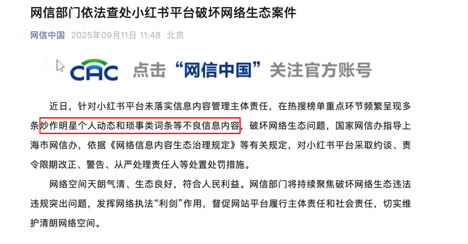 9月11日,一纸来自网信办的公告将小红书推上舆论风口浪尖。公告措辞严厉,直指小红书平台"热搜榜单频繁炒作明星个人动态和琐事类词条等不良信息内容,破坏网络生态"。