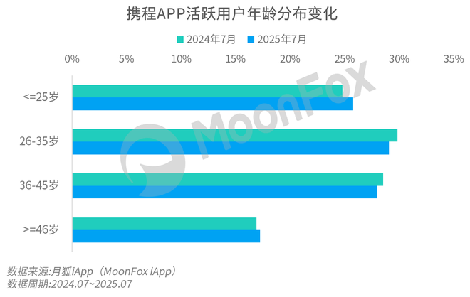 2024年4月,携程正式推出"老友会"品牌,面向50岁及以上用户群体提供康养旅居等银发旅游服务。截至2025年第二季度,携程老友会的会员数量及总交易额较2024年底均实现超100%的增长,产品覆盖超50个目的地及国家。300万+的会员规模显示出老龄化市场的巨大潜力。同时,携程面向年轻市场积极拓展"旅游+娱乐"模式,以演唱会、现场活动为驱动力,带动相关业务收入在二季度实现超100%的同比增长。根据极光月狐数据,2025年7月携程APP活跃用户中,25岁以下及46岁以上人群的占比相较于去年同期均有显著提高。活跃用户画像的变化态势表明,携程通过服务细分与产品创新,差异化满足了不同年龄段消费者需求,实现在全年龄段覆盖之上进一步优化用户结构,促进收入增长。