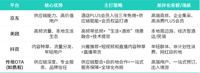 另一方面,传统OTA平台所面临的发展挑战也不容忽视。京东、美团、抖音等互联网巨头凭借流量优势和本地生活服务能力持续抢占酒旅市场,例如京东于618发布"京东酒店PLUS会员计划"吸引酒店品牌签约入驻。在市场挑战下,OTA平台需重点巩固自身护城河以应对日趋激烈的跨界竞争。
