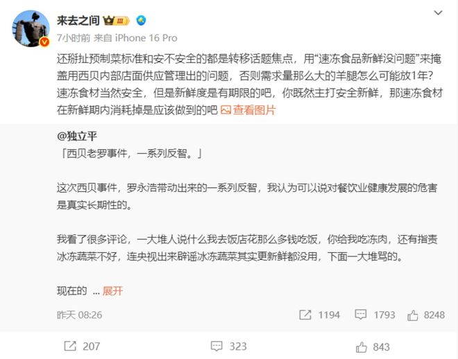 此举疑似对该事件有了一个明确的“站队”,对于西贝的食品安全管理问题提了很大的质疑声。