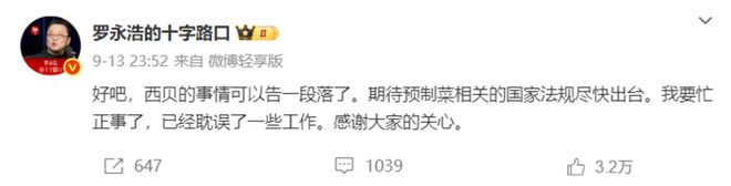 9月13日晚,罗永浩发文称,“好吧,西贝的事情可以告一段落了。期待预制菜相关的国家法规尽快出台。我要忙正事了,已经耽误了一些工作。感谢大家的关心。”
