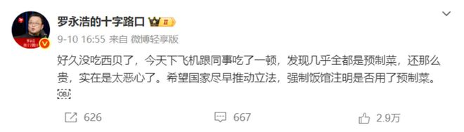 9月10日下午,罗永浩发微博吐槽西贝:“好久没吃西贝了,今天下飞机跟同事吃了一顿,发现几乎全都是预制菜,还那么贵,实在是太恶心了。希望国家尽早推动立法,强制饭馆注明是否用了预制菜。”,该言论引发网友热议。