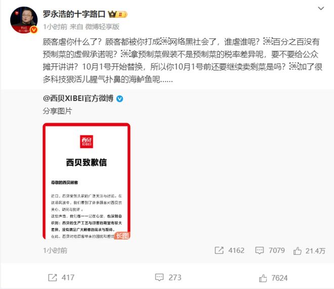 与此同时,9月12日下午,西贝官方微博发文,标题为《西贝全体伙伴致顾客的一封信》,其中对罗永浩言论进行回应并将西贝的“作业指导书”向社会公众公布。