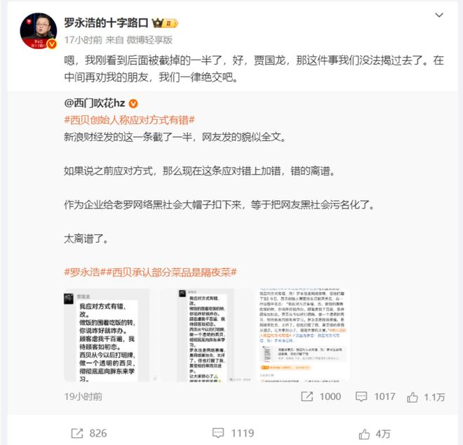 对此罗永浩也给予了微博回应,“这是西贝公司的合伙人,大家听听他说的话,这公司真的不可救药了……”。