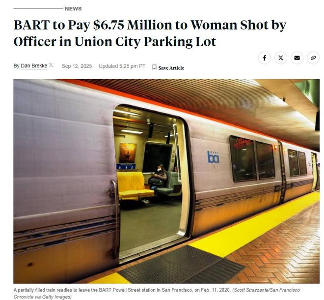 据报道,美国旧金山湾区快速交通系统(BART)近日宣布与33岁的华裔女子高女士(Jasmine Gao)及其家人达成和解协议,支付675万美元的赔偿金,以解决2024年11月发生的一起警察射击案件。该事件从最初警方单方面虚假陈述,到执法摄像头视频曝光,再到快速和解,引发了当地民众对警察执法公正性的广泛质疑。