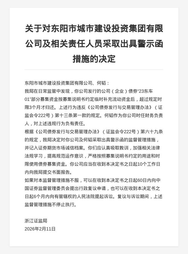 对此,浙江证监局决定对东阳市城市建设投资集团有限公司及何韬采取出具警示函的监督管理措施,并记入证券期货市场诚信档案。