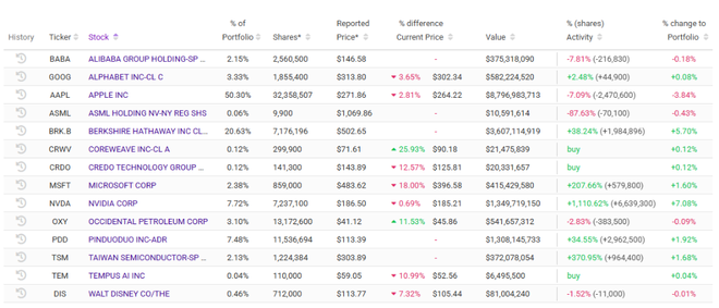 Q4,苹果依然是其头号重仓股,持仓市值高达87.97亿美元,占比50.3%。然而,Q4期间他减持了247.06万股苹果,减持幅度达7.09%。这一动作可能源于对单一标的持仓过重的风险控制,也可能是为了腾挪资金加码AI。