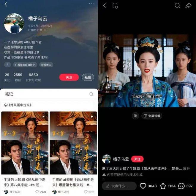 如小红书@橘子乌云 25年11月开始手搓短剧作品《她从画中走来》,目前已发布八集,最高单集点赞数达3000+,未来这样的创作者将越来越多。