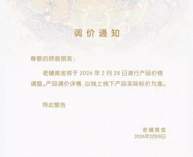 红星资本局2月19日消息,老铺黄金(06181.HK)淘宝旗舰店昨日发布调价通知称将于2026年2月28日进行产品价格调整。产品调价详情以线上线下产品实际标价为准。
