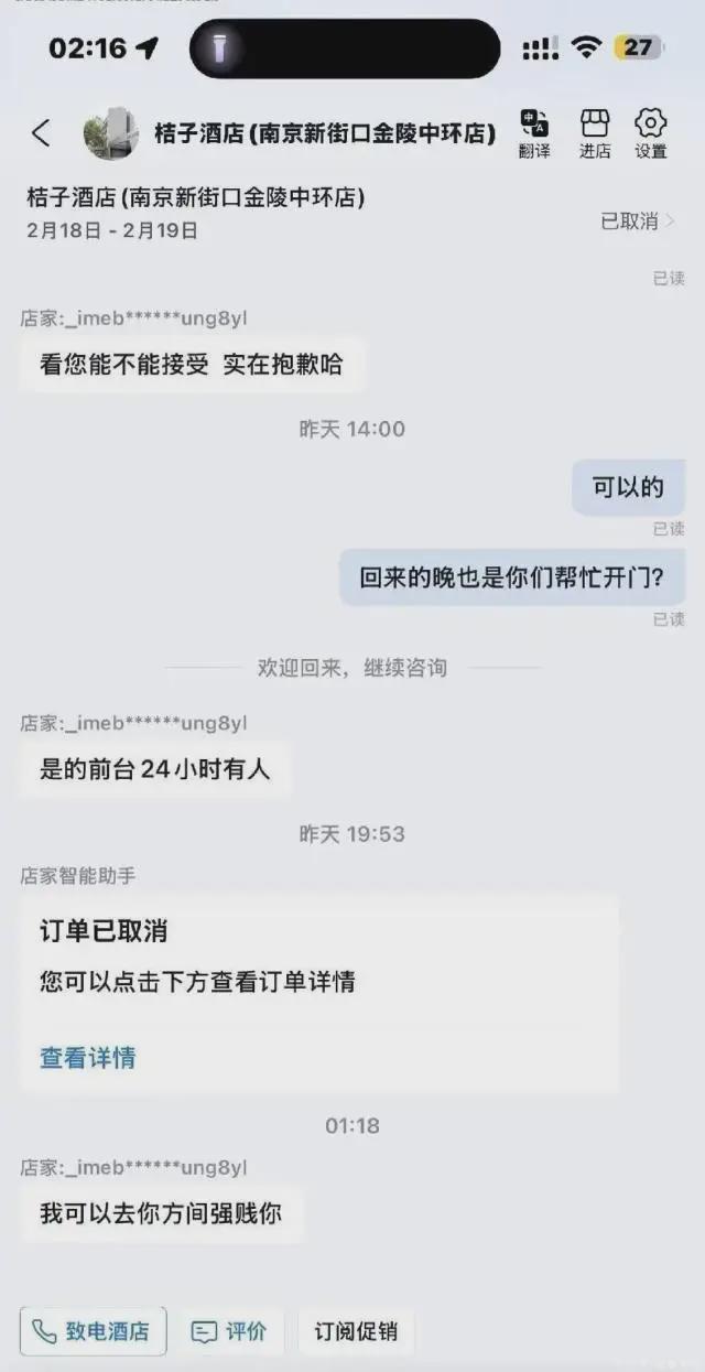 聊天截图显示,该消费者在平台预订了桔子酒店(南京新街口金陵中环店)2月18日-19日的房间,后来该消费者取消订单后,该酒店店家于凌晨1点多发送信息称“我可以去你方间强贱你”。