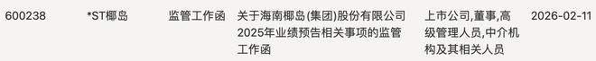 根据上交所日前发布的公告,*ST椰岛(600238)收到了监管工作函。该函涉及的对象包括上市公司、董事、高级管理人员及中介机构相关人员,处理事由为关于*ST椰岛2025年业绩预告相关事项。