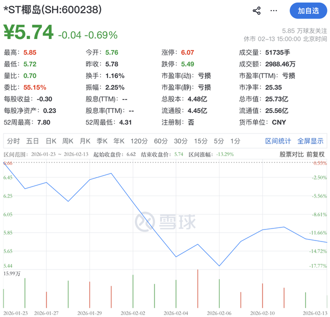 二级市场上,截至2月13日收盘,*ST椰岛下跌0.69%报5.74元/股,总市值为25.73亿元。近一月,公司股价累计下跌13.29%。