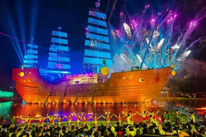 该演出以60米的海船船体为背景,覆盖超2000平米的水域,融合水、火、声、光、电等视听特效,模拟海船劈波斩浪的壮丽出行,演绎了“海上丝路启航”、“沿途西域风情”、“海盗突袭交战”等历史场景,让观众梦回大宋。