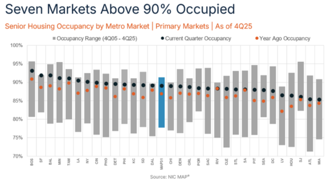 更值得关注的是,旧金山、洛杉矶、达拉斯、芝加哥的入住率,已经接近NIC自2005年追踪该数据以来的历史峰值。这意味着,养老社区的火爆并非局部现象,而是行业全面升温的体现,而这一趋势,还将随着需求的进一步释放持续加速。