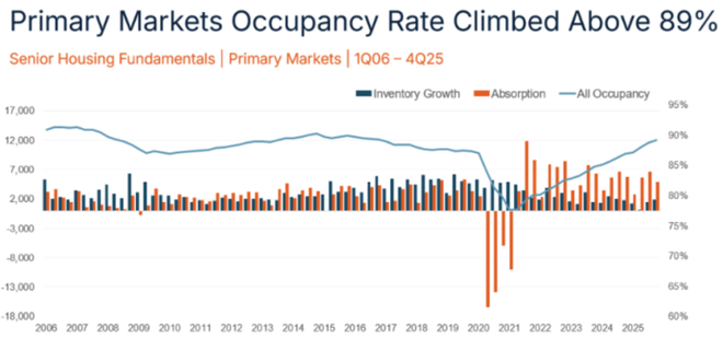 美国国家养老住房与护理投资中心(NIC)2026年1月的最新数据,印证了这一趋势:2025年第四季度,其追踪的31个主要市场养老社区入住率升至89.1%,较上一季度增长0.4个百分点,实现了连续18个季度攀升。这一数据背后,是婴儿潮一代刚需的持续释放,也是行业复苏的明确信号。