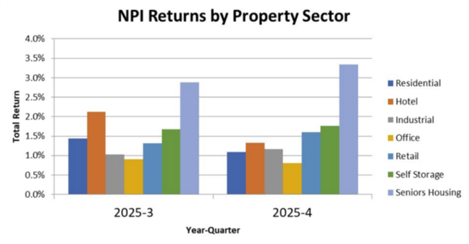 行业的火爆,从来都会快速传导到资本市场。2025年第四季度,老年住房的总回报率达3.3%,比整体NPI总回报率1.1%高出220个基点,远超住宅、酒店、写字楼等其他物业类型,成为房地产领域的“增长黑马”。