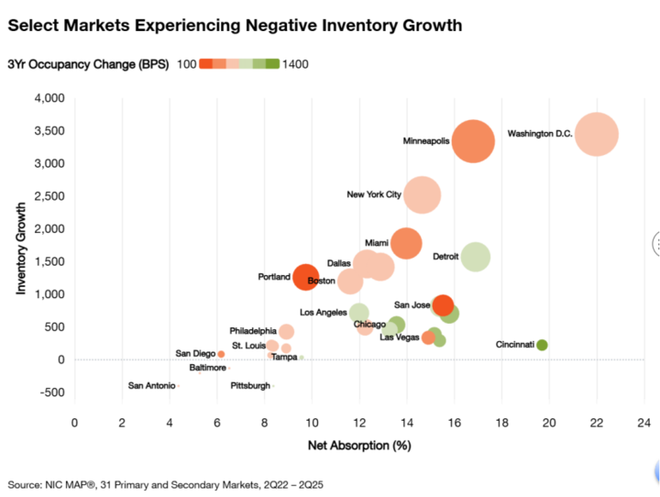 与此同时,市场分化也愈发明显。31个主要市场中,有7个入住率超90%,比上一季度多2个;波士顿以93.1%领跑,旧金山和巴尔的摩紧随其后,均达91.9%。反观迈阿密、亚特兰大、圣何塞,因区域供需匹配度不足,成为表现最差的三个市场,入住率均低于87%。
