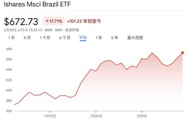 这一布局迅速获得了回报。iShares MSCI Brazil ETF在今年1月飙升了17%,创下自2020年以来的最佳单月表现。这一涨势主要得益于美元走软和商品价格走高,推动了包括矿业巨头Vale SA和国有石油生产商Petroleo Brasileiro SA在内的权重股实现两位数的大幅上涨。