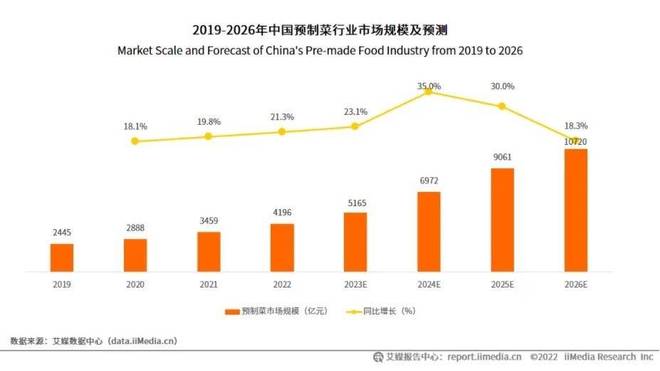 对生产端而言,预制菜让产业链增值空间更大:初级农产品利润低、损耗高,深加工越多,利润越高,也能为产地带来收益。政策同样加码。《中央一号文件》提出“提升净菜、中央厨房等产业标准化和规范化水平,培育发展预制菜产业”。据艾媒咨询《2022年中国预制菜产业发展白皮书》,2022年中国预制菜市场规模4196亿元,同比增长21.3%;预计3-5年将以约20%年增速增长,2026年有望达万亿规模。