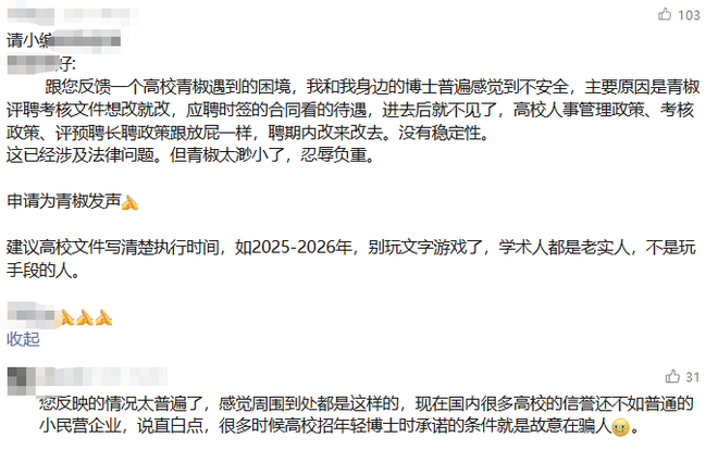 第二点,作为一种特殊组织,不少高校的内部权力结构和文化氛围助长了这种不对称的制度设计。资深教授往往掌握职称评审、项目分配、学术评价的话语权,他们自然缺乏动机对自己“动刀”。而青年教师作为学术体制的底层,缺乏议价能力和制度性保障,很容易成为改革成本的承担者。