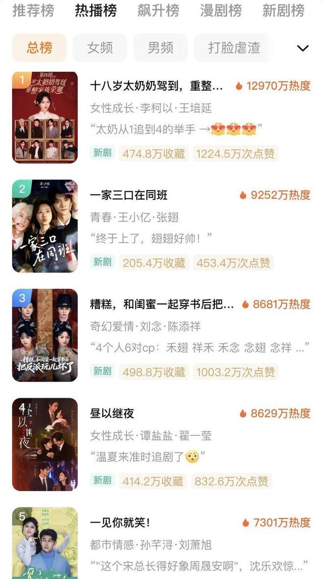 其中,《太奶奶4》《昼以继夜》《糟糕》三部都为女频群像剧,在红果热度值分别突破1.7亿、1亿和1.2亿;《昼以继夜》和《糟糕》作为没有IP加持的原创作品,热度值已经逼近去年《好一个乖乖女》的历史峰值。