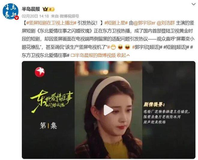 值得注意的是,今年春节期间,一些播出成绩不错的竖屏短剧开始“上星”播出。东方卫视2月18日在黄金时段播出了曾在红果热播的《东北爱情往事之闪婚玫瑰》(郭宇欣、刘浩群主演),屏幕两侧增添情景提要等图文指引,引发了不少观众的震惊和讨论。