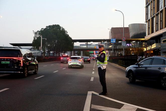 2月23日早上五点,机场公安交管支队民警在浦东机场疏导车辆。