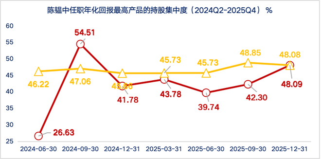 数据来源:Wind,基金定期报告,红色是陈韫中任职年化回报最高产品的持股集中度,即重仓股票市值占基金净值的比例,橙色为同类基金的平均水平