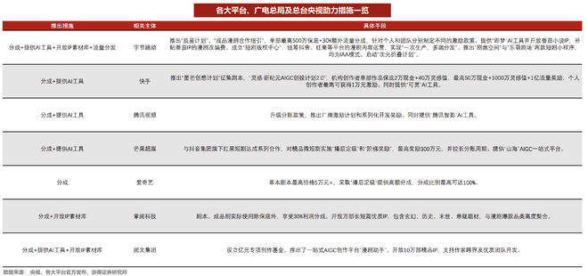 自2025年10月以来,字节、快手、腾讯视频、芒果、爱奇艺等密集推出扶持政策,组合拳主要落在分成、AI工具、开放IP素材库与流量分发四类资源上。
