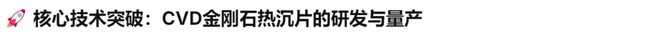 尺寸与性能领先:公司采用化学气相沉积(CVD)技术,成功实现了从2英寸到6-8英寸多晶金刚石晶圆热沉材料的突破-。其产品厚度可薄至5-30微米,热导率稳定在1000-2200W/m·K,关键指标达到国际同类产品水平,部分性能(如表面粗糙度、翘曲度)甚至优于国外产品。