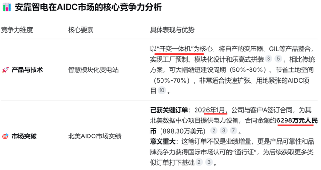 安靠智电(300617)在AIDC(AI数据中心)市场的竞争力非常强劲,核心体现在凭借独特的“开变一体机”技术,精准抓住了北美市场因AI发展带来的历史性缺电机遇,已实现从0到1的突破,并有望迎来订单的快速释放。