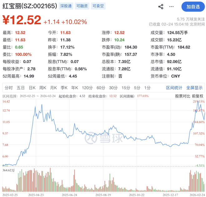 二级市场上,截至2月24日收盘,红宝丽上涨10.02%报12.52元/股,总市值为92.06亿元。