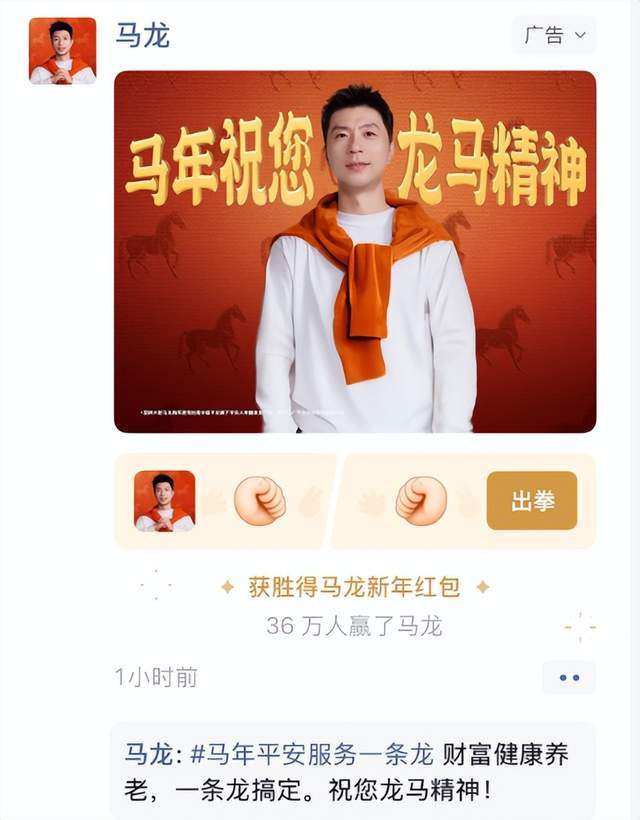 连金融机构也在朋友圈用马龙的名字来做宣传:马年平安服务一条龙。