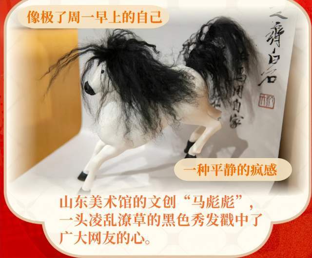 另一匹爆火的马叫——"马彪彪",是山东美术馆展出的一款软陶小马文创,网友从它的发型中感受到了"放荡不羁",于是给它取名"马彪彪"。