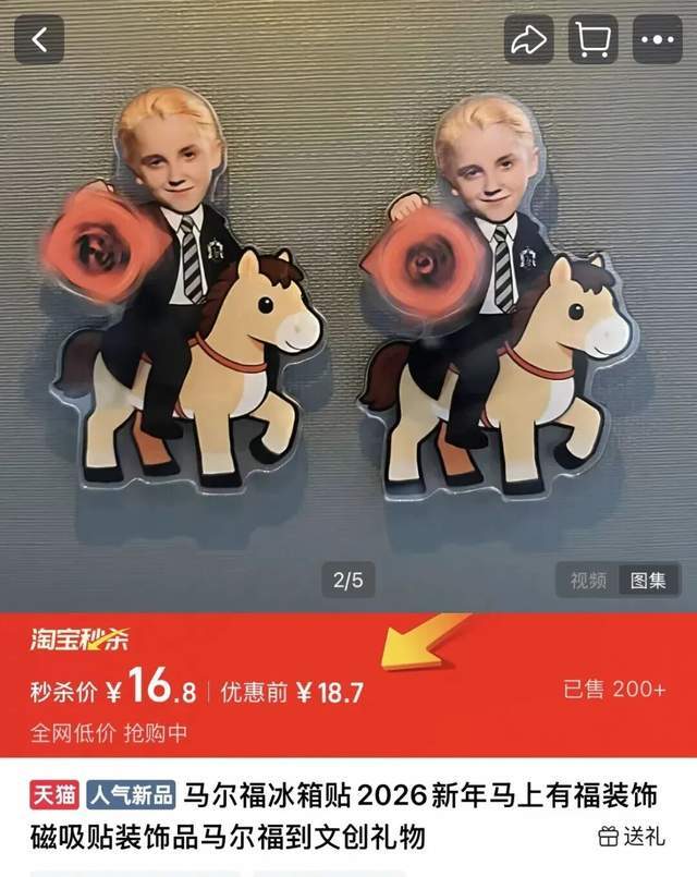 《哈利波特》中有个角色叫德拉科·马尔福,本来是个反派角色,因为译名中自带"马"和"福",被网友视作马年吉祥物,角色头像被制作成春联、贴纸、冰箱贴等周边产品,销量还挺好。
