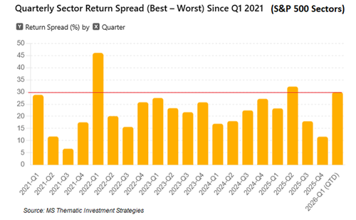 然而,大盘指数之所以能够维持震荡格局,是因为资金迅速流向了防御性及周期性板块。在此期间,工业板块上涨13%,日常消费品板块上涨16%,材料板块上涨22%,能源板块更是大涨25%。从2021年以来的季度回报率来看,当前季度标普500指数表现最好与最差板块之间的收益率差,已达到自2021年以来的第三高水平。