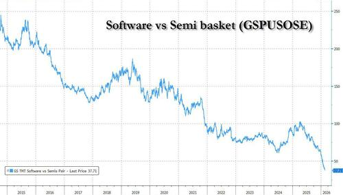 对冲基金的资金流向进一步加剧了市场的极端头寸分布。据摩根士丹利主经纪商业务(PB)的数据显示,今年以来,对冲基金净买入半导体和从电力到AI受益股的全栈AI资产,将这些板块的敞口推高至2020年以来的最高点。而在硬币的另一面,摩根士丹利的基础设施软件篮子(MSXXINSW)成为今年以来遭到抛售最多的主题,其仓位已降至2020年以来的第0个百分位。