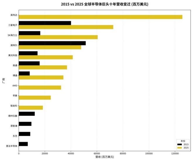 2015年的TOP10中,除了高通和博通,其余大部分都是IDM(集成设备制造商)或拥有强大制造能力的厂商(如英特尔、三星、SK 海力士、东芝、意法半导体、TI)。而到了2025年,TOP10中出现了更多的Fabless(无晶圆厂)或IP/设计驱动的厂商:英伟达、AMD、苹果、联发科。