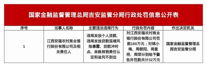 针对以上违法违规行为,国家金融监督管理总局吉安监管分局对其罚款180万元。对相关责任人姚小梅、周朝阳、周星桥、周荣分别警告并罚款共计32万元。