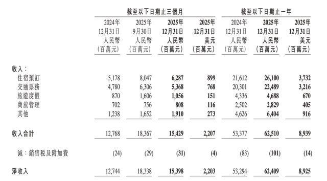 2025年,携程的其他收入主要来自出售股份的收入。去年6月17日,携程宣布,出售持有的印度在线旅游巨头MakeMyTrip Limited的B类普通股,代价约25亿美元至30亿美元。该笔收入已在携程2025年第三季度财报中体现。