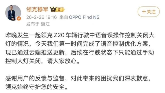2月26日,领克汽车销售有限公司副总经理领克穆军在社交平台上发文表示,关注到发生一起领克Z20车辆行驶中语音误操作控制关闭大灯的情况,于第一时间完成了语音控制优化方案,现已通过云端推送更新,后续在行驶状态下只能通过手动控制大灯关闭,并对此带来的困扰深表歉意。