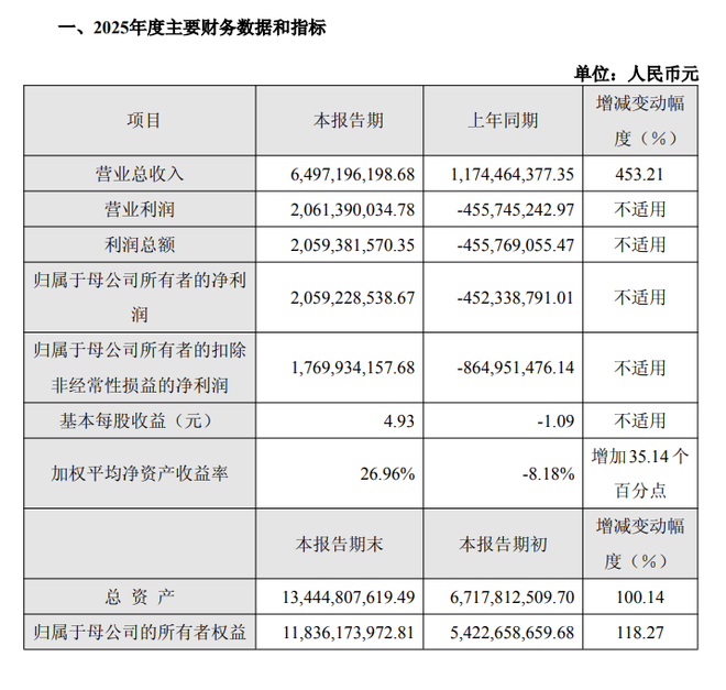 盈利方面实现历史性突破,全年归母净利润20.59亿元,上年同期为亏损4.52亿元;扣除非经常性损益后的净利润为17.70亿元,上年同期为亏损8.65亿元。两者差额约2.89亿元,显示非经常性损益贡献有限,业绩增长主要由主营业务驱动。基本每股收益由-1.09元升至4.93元,加权平均净资产收益率由-8.18%回升至26.96%,较上年增加35.14个百分点。