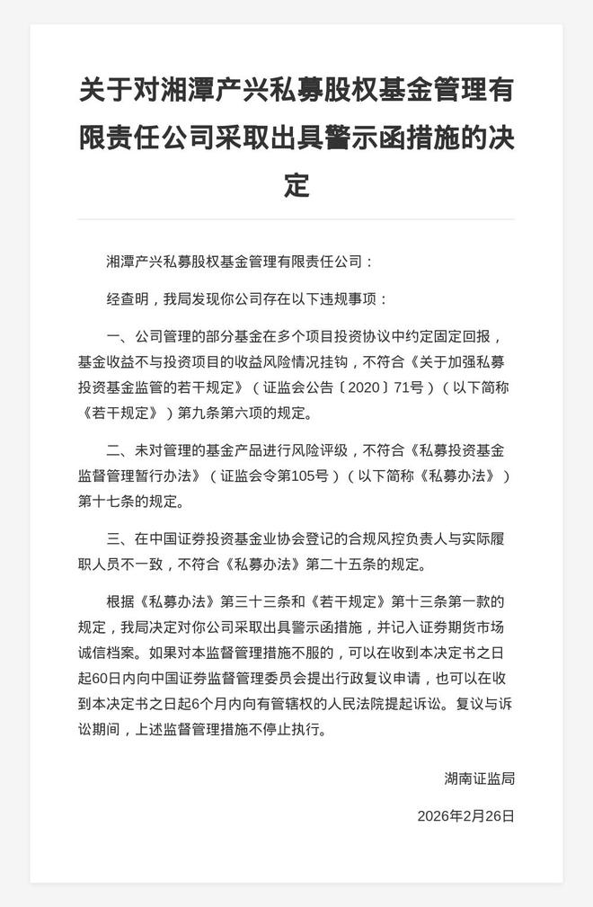 湘潭产兴私募被出具警示函,涉未对基金产品进行风险评级等