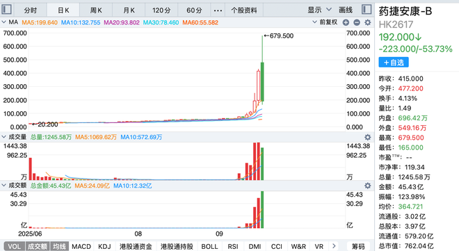 公告发布后,药捷安康股价连续4个交易日大涨,累计涨幅近500%。9月16日,药捷安康股价一度升至679.50港元,较发行价上涨近50倍,公司总市值最高逼近2700亿港元。