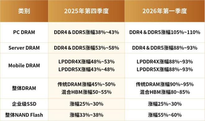 具体到细分领域,2026年第一季PC DRAM价格将季增100%以上,涨幅达历史新高。Server DRAM价格上涨约90%,幅度创历年之最。至于Mobile DRAM市场,第一季LPDDR4X、LPDDR5X合约价皆大幅上调至季增90%左右, 幅度同样是历来最高。在NAND Flash市场部分,2026年第一季Enterprise SSD价格将季增53-58%,创下单季涨幅最高纪录。