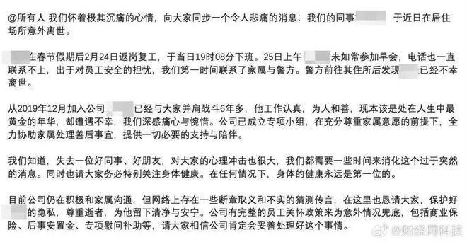 近日,米哈游36岁程序员被曝复工当晚猝死。2月27日,米哈游内部发文回应员工意外离世,称该员工今年2月24日返岗复工,当日19时08分下班,25日上午因未如常参加早会,且联系不上,公司第一时间联系了家属与警方。警方前往其住所后发现,该员工已不幸离世。官方明确表示,该员工不存在超负荷工作的加班情况,复工后下班时间正常,互联网中“春节加班导致过度劳累”的猜测与事实不符。同时,针对网传“赔付3万元抚慰金”的说法,米哈游方称此为不实信息,公司目前正在与家属积极沟通中。(财经网科技、封面新闻)