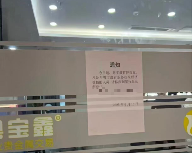 今日起,粤宝鑫暂停营业,凡是与粤宝鑫有业务往来经济受损的人员,请移步派出所登记。