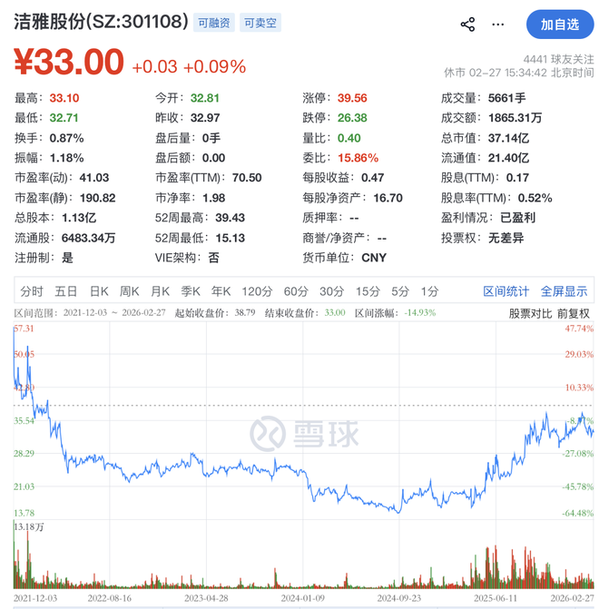2021年12月3日,洁雅股份在深交所创业板上市,该股最新股价报33元/股,总市值37.14亿元,其股价已破发多年。
