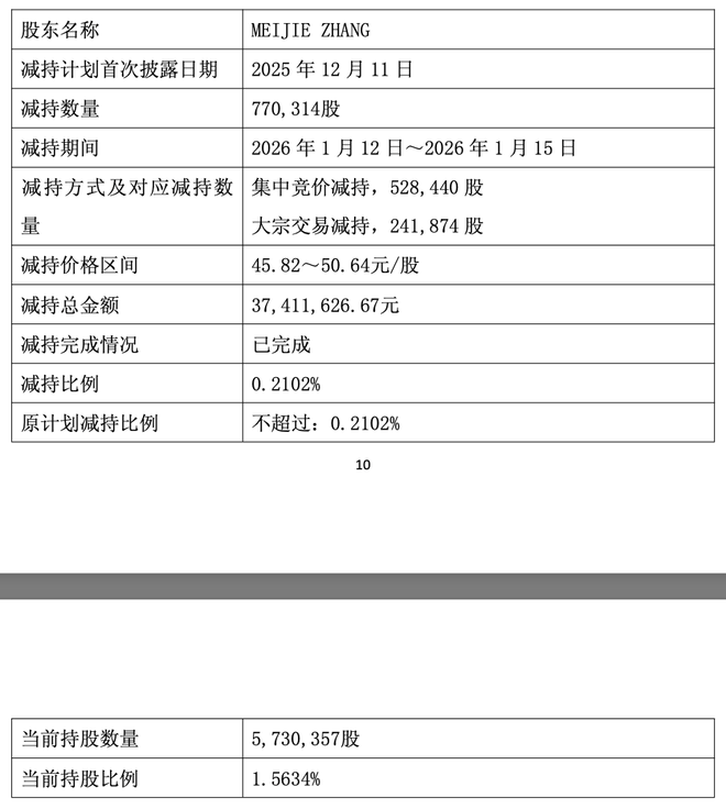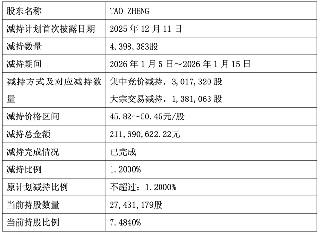 其通过集中竞价交易减持301.73万股,大宗交易减持138.11万股,合计减持439.84万股,占公司总股本的1.20%,减持总金额达2.12亿元,减持价格区间为45.82元/股至50.45元/股。减持后,TAO ZHENG持股数量从3182.96万股降至2743.12万股,持股比例从8.68%降至7.48%。