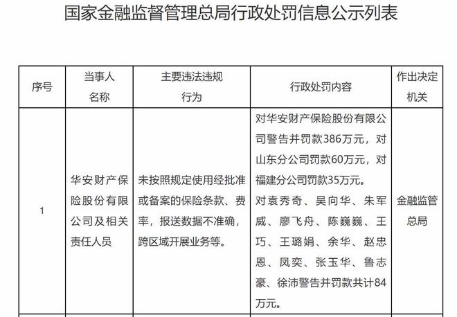 蓝鲸新闻2月28日讯(记者 陈晓娟)刚开年,华安财产保险股份有限公司(下称"华安财险")就收到一张大额罚单。日前,金融监管总局对其开出565万元罚单,其中,总公司被罚386万元,山东分公司被罚60万元,福建分公司被罚35万元,相关责任人员合计被罚84万元。值得关注的是,相关责任人中的凤奕、徐沛、吴向华,不乏指向华安财险现任两名总经理助理及总精算师。